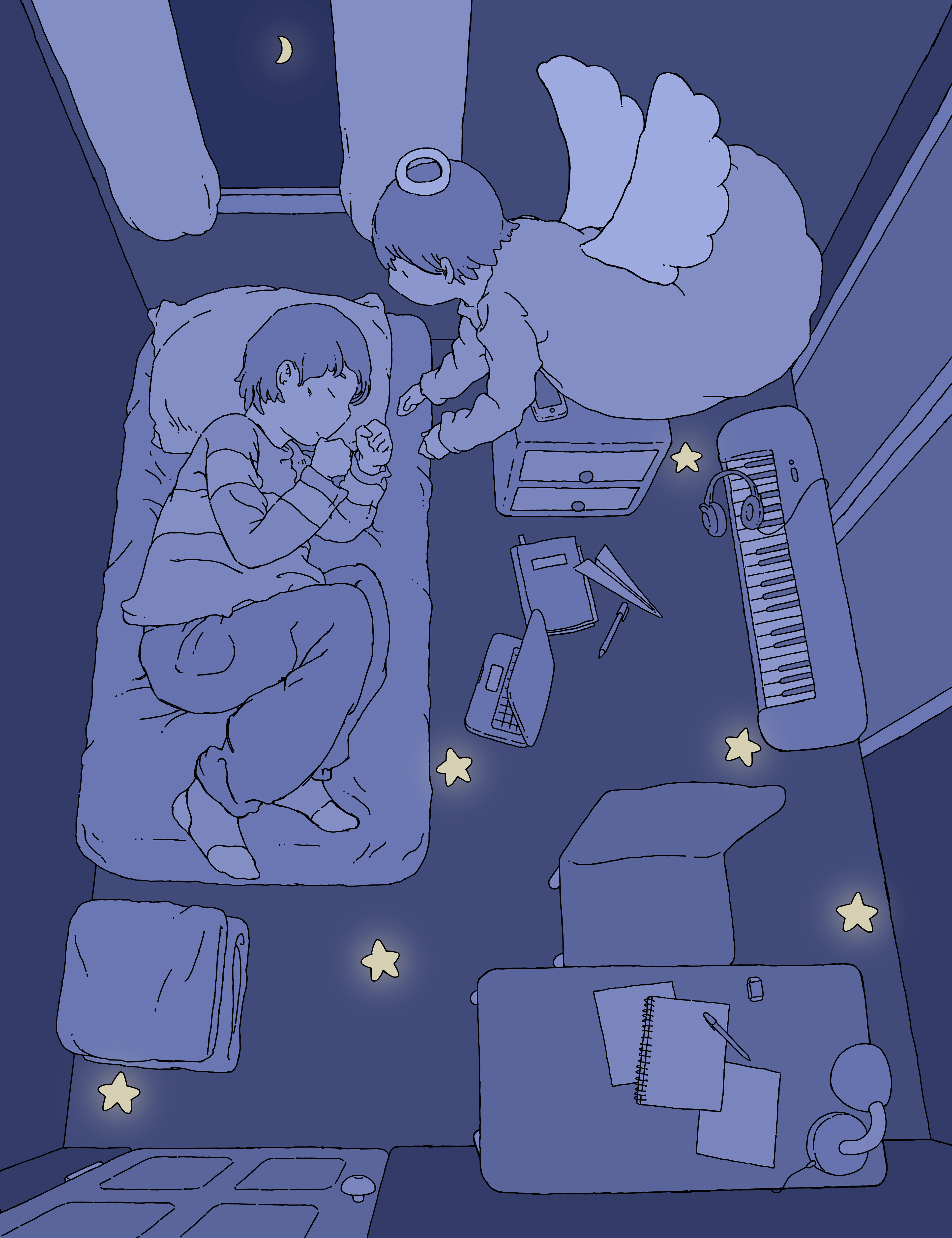 An angel watches over a boy as he rests.